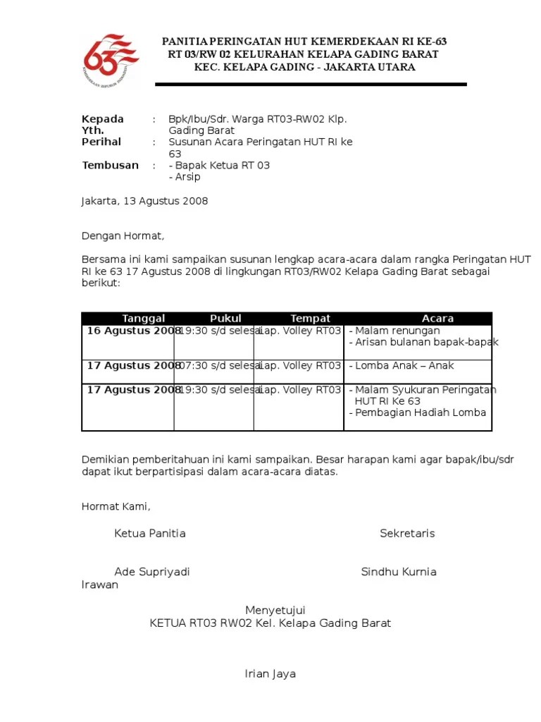 Kumpulan contoh surat undangan rt 17 agustusan hut ri ala 8 contoh. Kegiatan 17 agustus surat permohonan sumbangan warga contoh surat . Contoh surat undangan rapat rt 17 agustus jagoundangan com 11. Contoh surat undangan rapat karang taruna desa acara 17 agustus. Pasalnya, acara ini pasti menggunakan lapangan di .